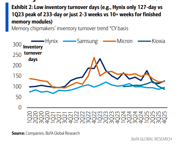 首先,库存水平已经降至“警戒线”以下。以SK海力士为例,其库存周转天数已从2023年一季度的233天峰值,大幅下降至仅127天。更惊人的是,成品存储模组的库存仅能维持2-3周,而正常水平通常在10周以上。这意味着,一旦需求稍有波动,供应链将面临极大的缺货压力。