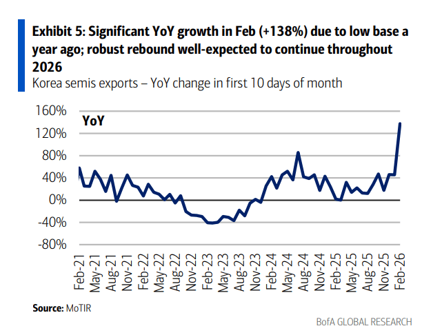 数据不会说谎。台湾地区1月份的销售数据表现强劲,南亚科技、威刚(ADATA)、创见(Transcend)和群联(Phison)等厂商的月度销售额环比增长超过20%,同比更是翻倍。韩国2月前10天的半导体出口额也同比激增138%。